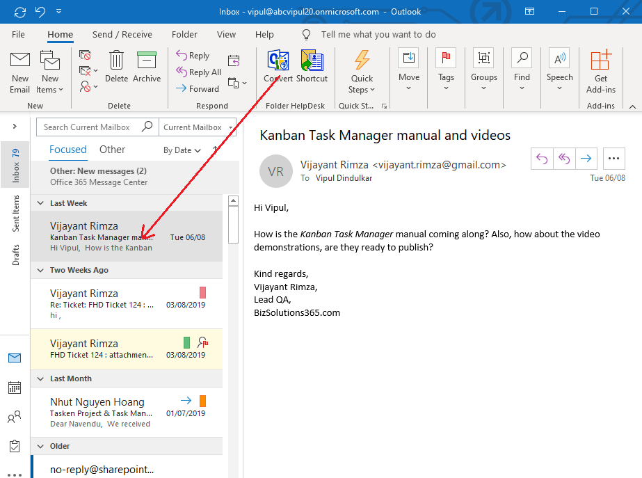 If you get an e-mail in the inbox that you want to convert to a ticket manually, click on the Folder HelpDesk button in the Outlook toolbar. Then the e-mail gets converted as it should.